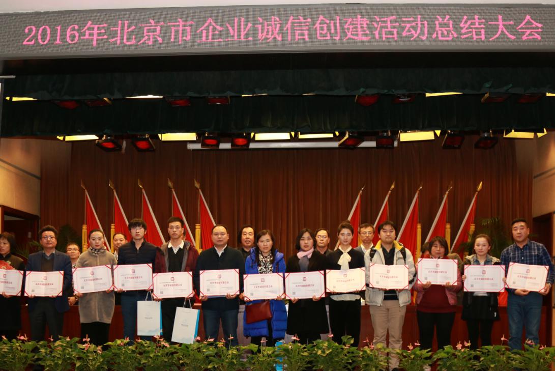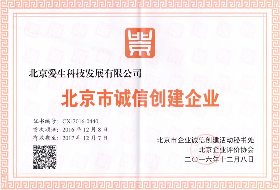 2016年9月,爱生公司配合北京市社会信用体系建设,参加了2016年的诚信创建企业的评选活动,继十月爱生获得北京市“诚信长城杯企业”荣誉后,在12月8日的北京市2016年企业诚信创建活动总结大会上又被表彰为“北京市诚信创建企业。”这也是2016年爱生公司在年底获得的最有份量的两个荣誉,是对爱生18年来坚持诚信经营的高度认可。